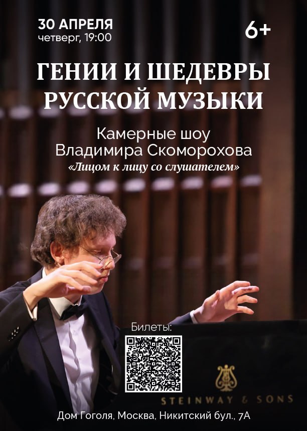 Камерное шоу «Лицом к лицу со слушателем» — это уникальный формат живого общения пианиста и публики. Исполнитель не только раскрывает «душу» звучащих произведений, но и на ясном, образном русском языке рассказывает о замысле композитора, помогая слушателю глубже почувствовать музыку.В исполнении лауреата международных конкурсов Владимира Скоморохова (фортепиано) прозвучат фортепианные сочинения русских композиторов.
